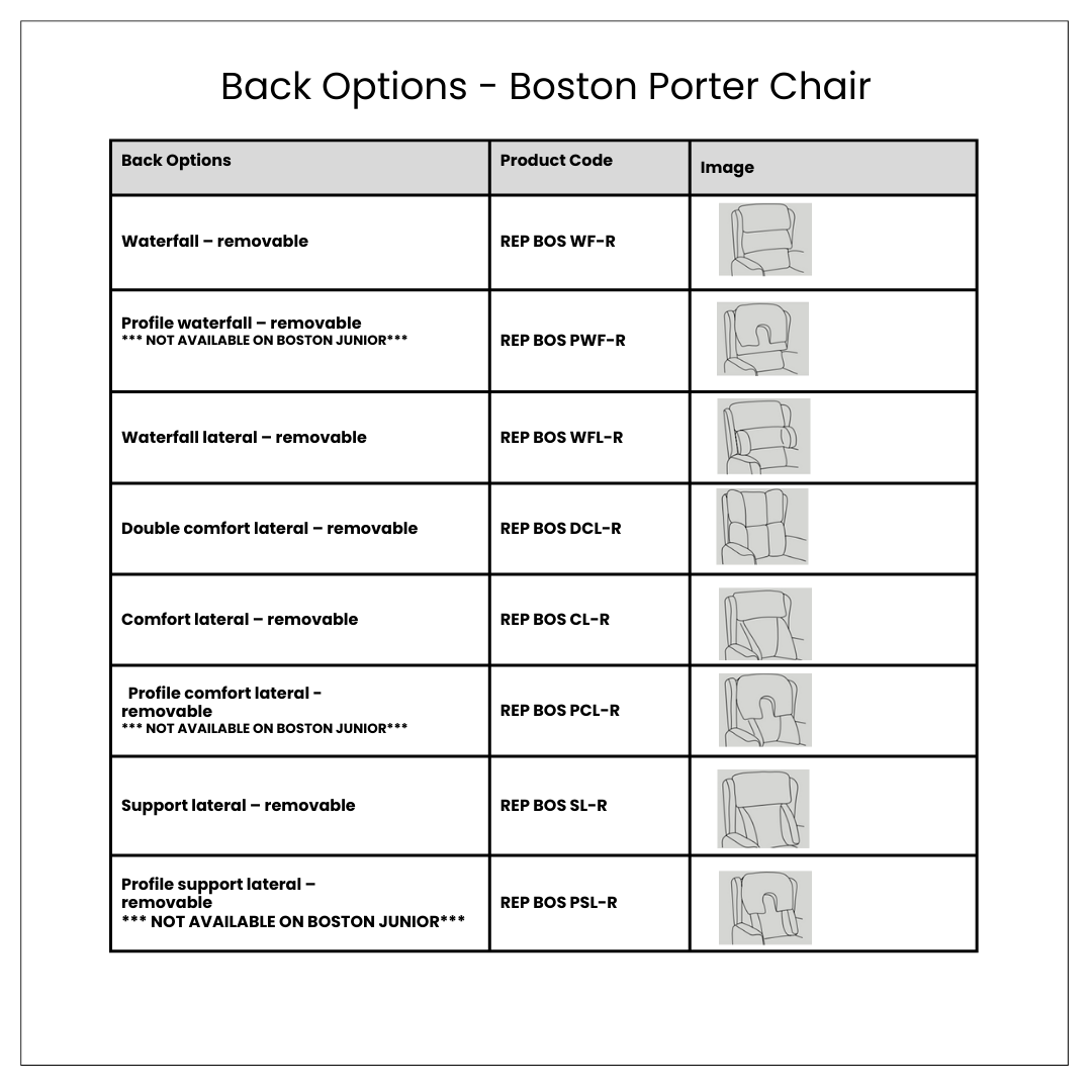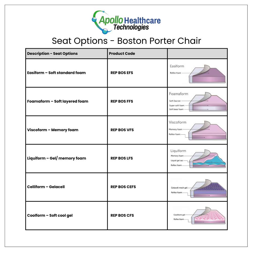 With its choice of interchangeable seat and back cushion designs, each with its own unique pressure management features, the Boston Porter Chair caters to a wide range of users with differing conditions.